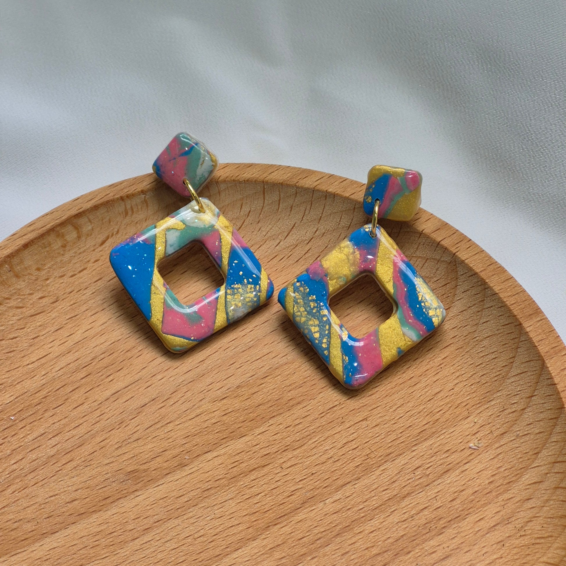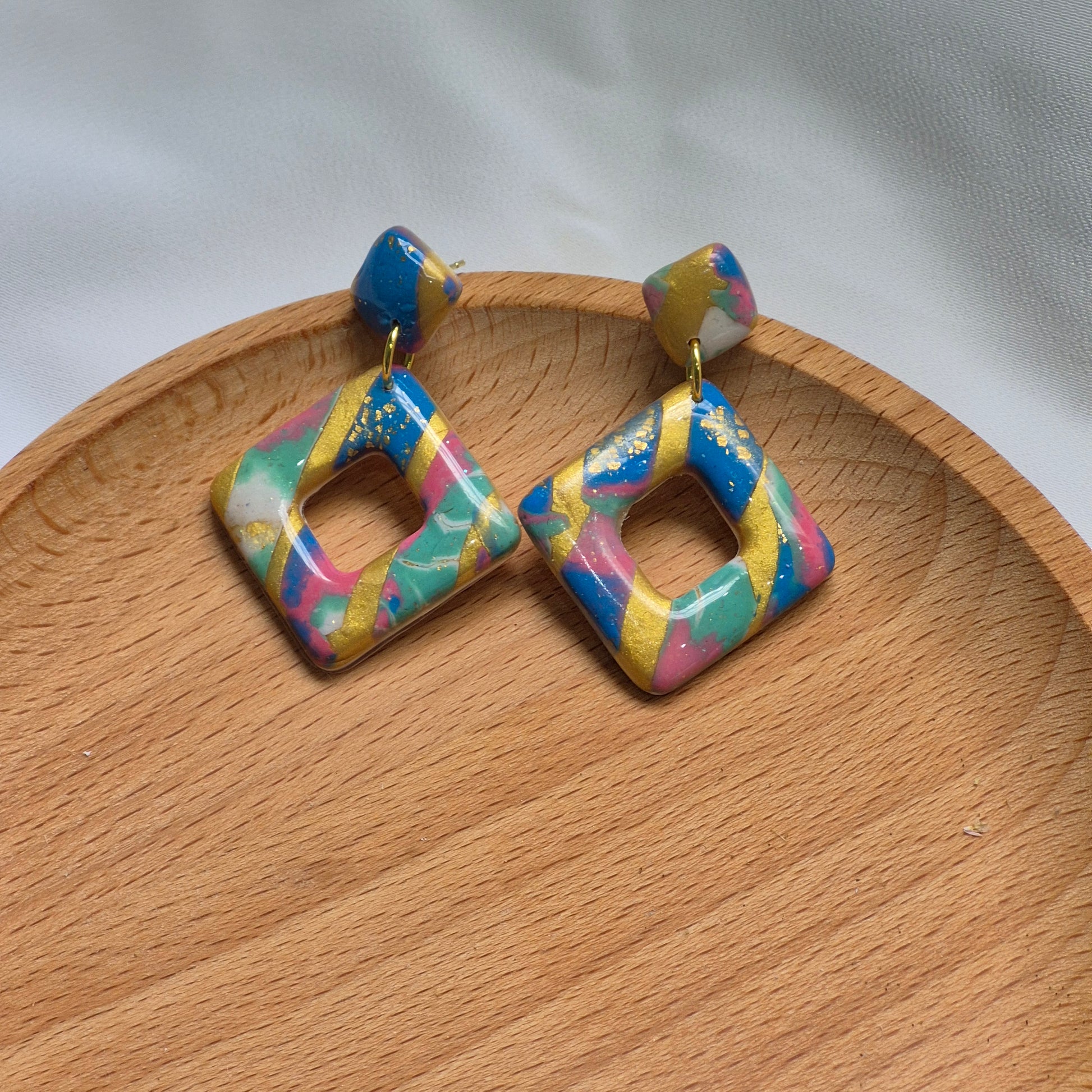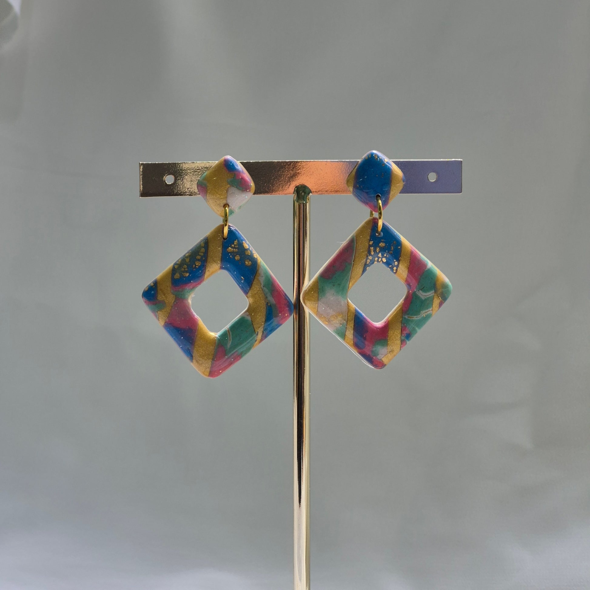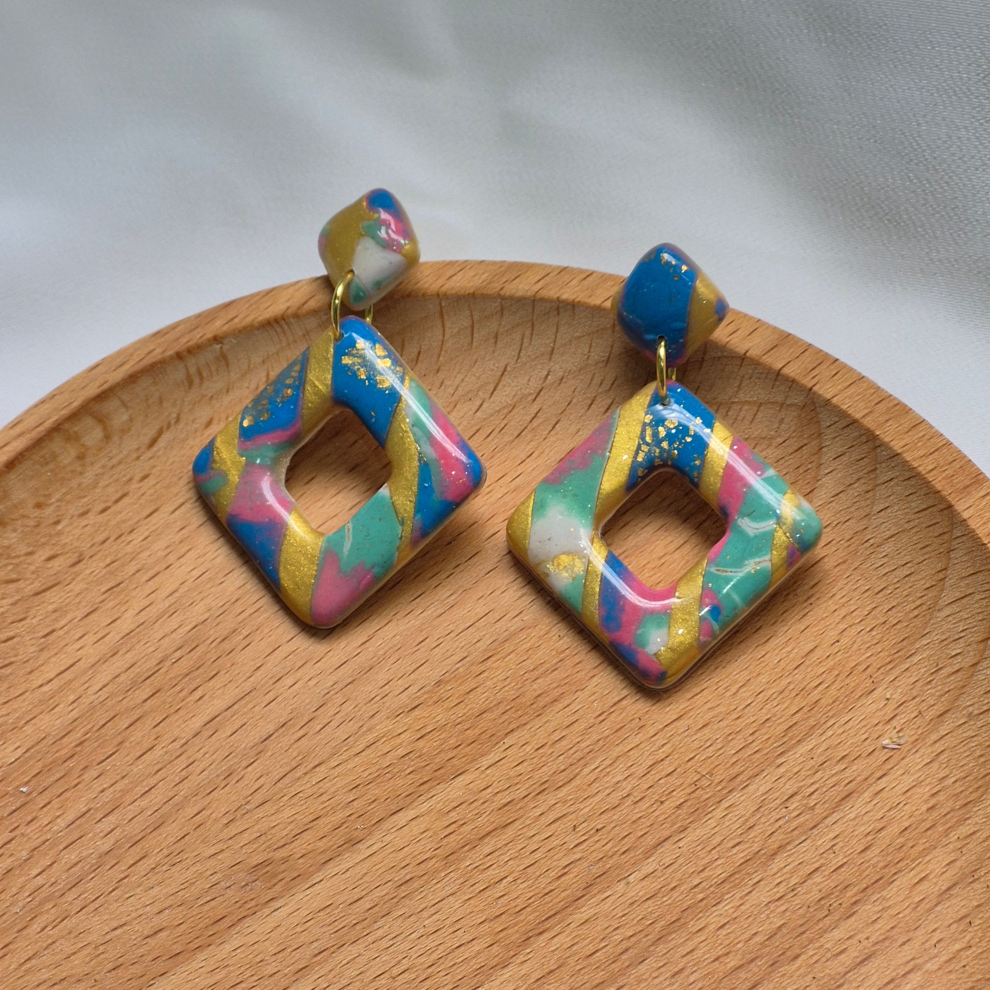 Sumérgete en el colorido mundo del verano con los pendientes "Prisma Tropical". Hechos a mano con arcilla polimérica, estos pendientes de diseño geométrico en forma de rombo abierto destacan por su alegre mezcla de colores vibrantes: azul cielo, rosa fucsia, verde menta y toques de dorado que simulan pinceladas de luz. Su acabado brillante resalta la intensidad de los colores, evocando paisajes tropicales y puestas de sol costeras.