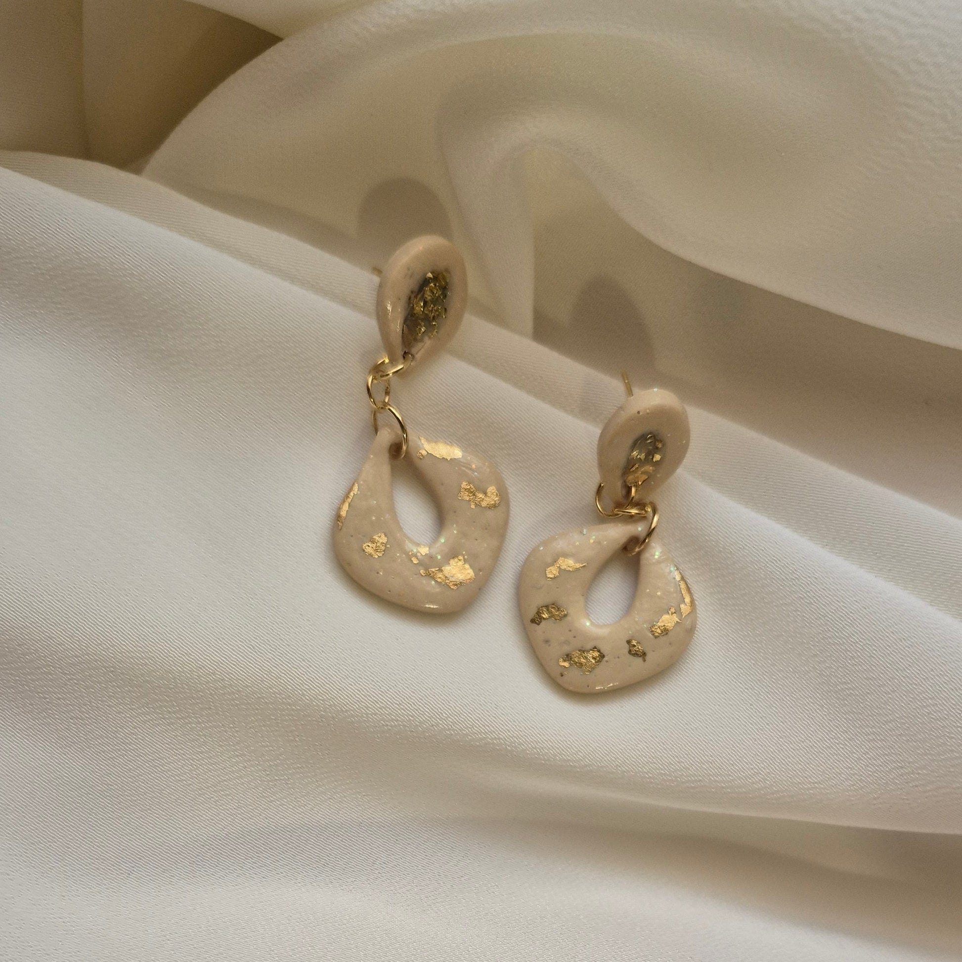 Elegantes pendientes colgantes hechos a mano en tonos crema con detalles de pan de oro incrustado. Su diseño orgánico y fluido los hace perfectos para un look sofisticado y moderno. Ideales para ocasiones especiales o para añadir un toque de lujo a cualquier atuendo.