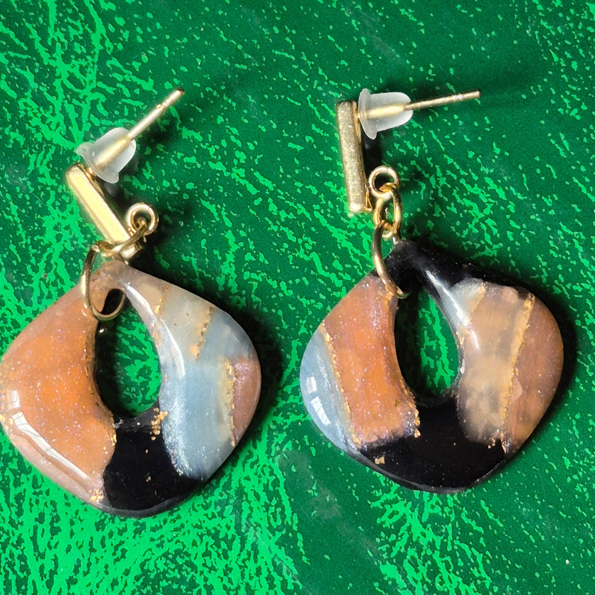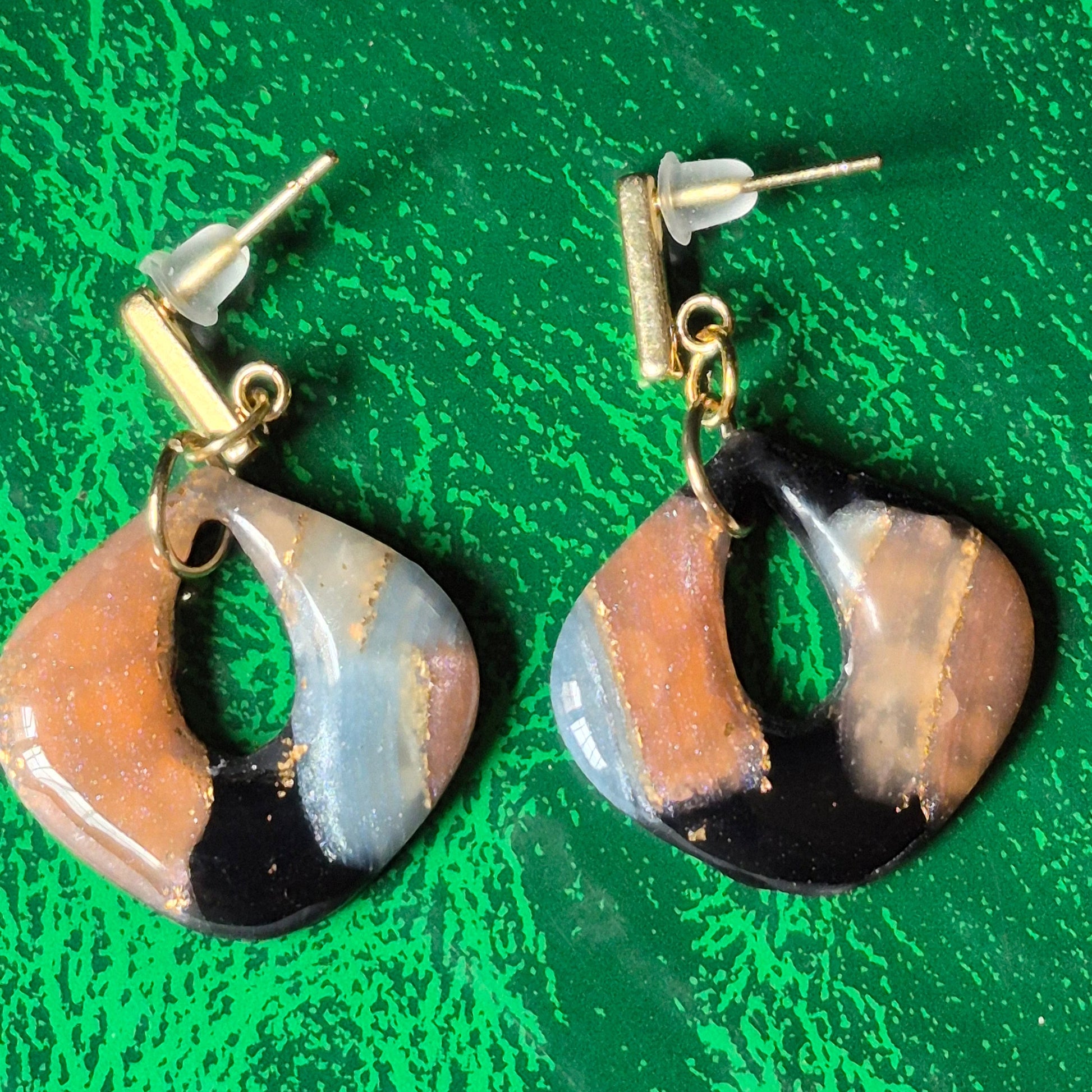 Elegantes pendientes colgantes con un diseño geométrico y un orificio central, creando un efecto moderno y sofisticado. Presentan una combinación armoniosa de colores negro, azul, dorado y terracota con sutiles detalles brillantes. La pieza superior dorada añade un toque de lujo, convirtiéndolos en el accesorio perfecto para destacar cualquier atuendo con estilo y originalidad.