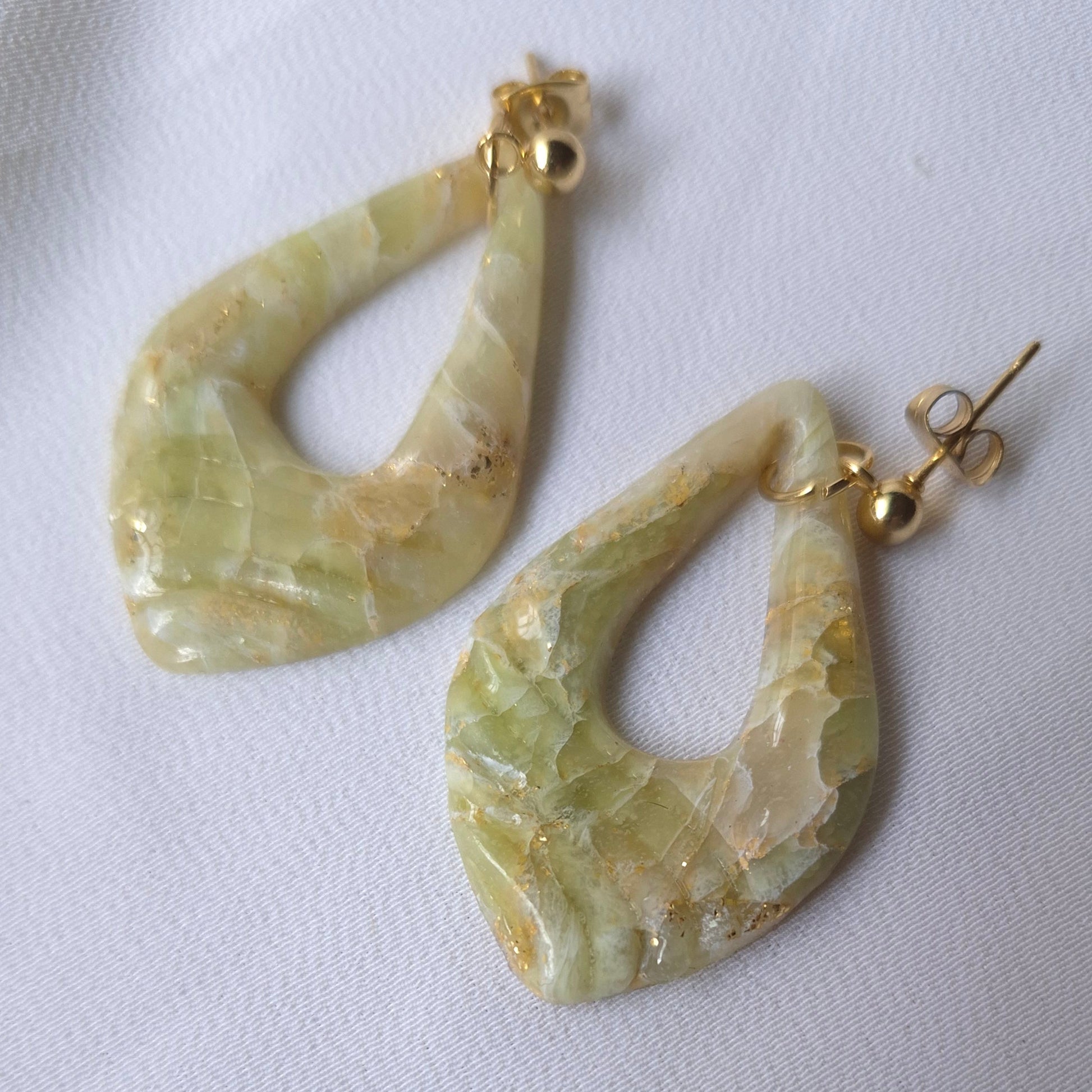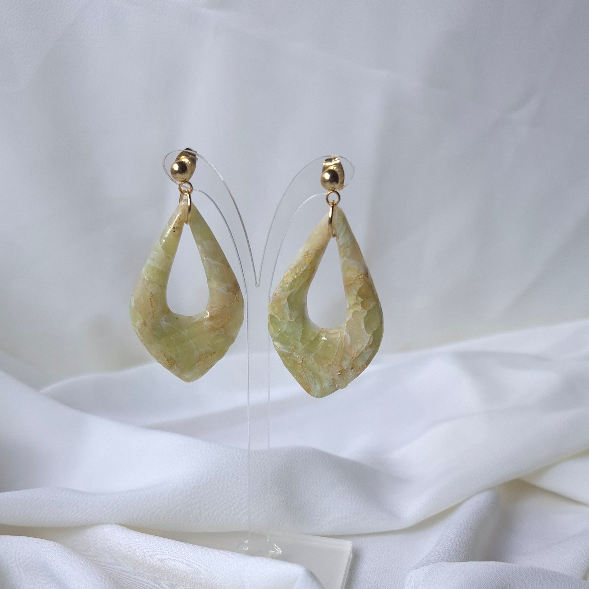 Descripción: Pendientes en forma de gota en suaves tonos verdes y beige, con delicados detalles dorados que evocan la belleza de la piedra natural. Su diseño único y sofisticado los convierte en el complemento perfecto para un estilo elegante y fresco. ¡Muestra la armonía de la naturaleza en cada ocasión!