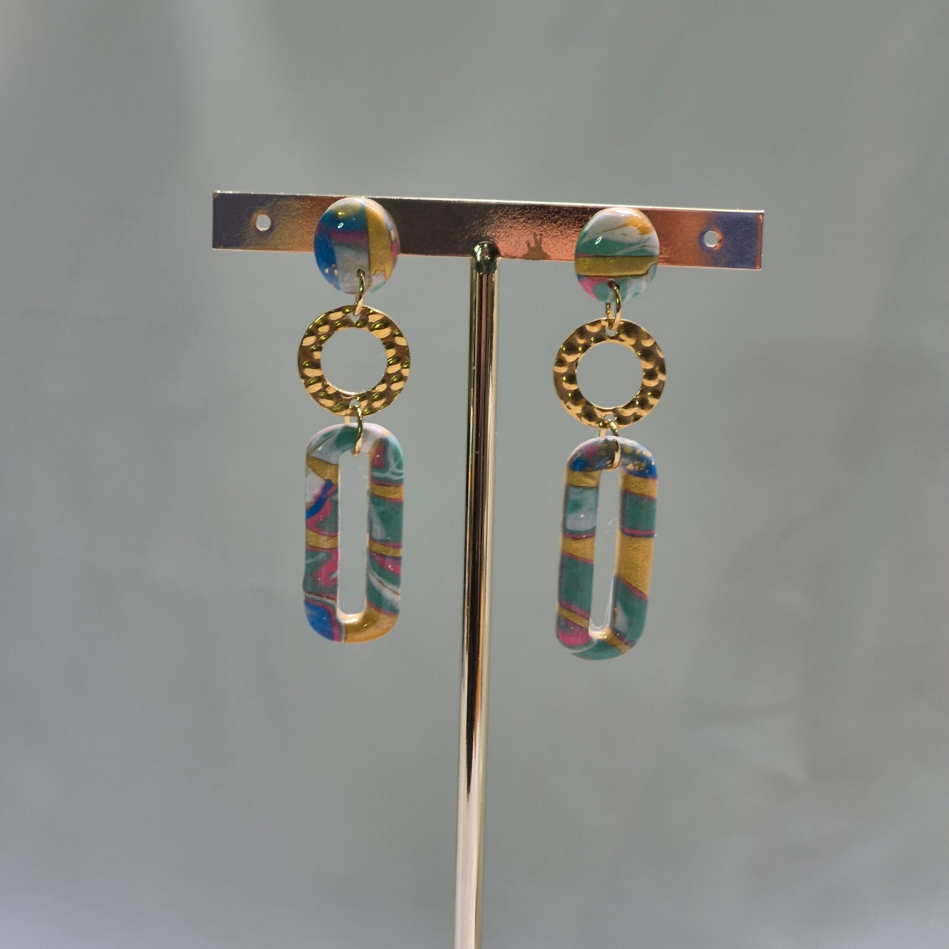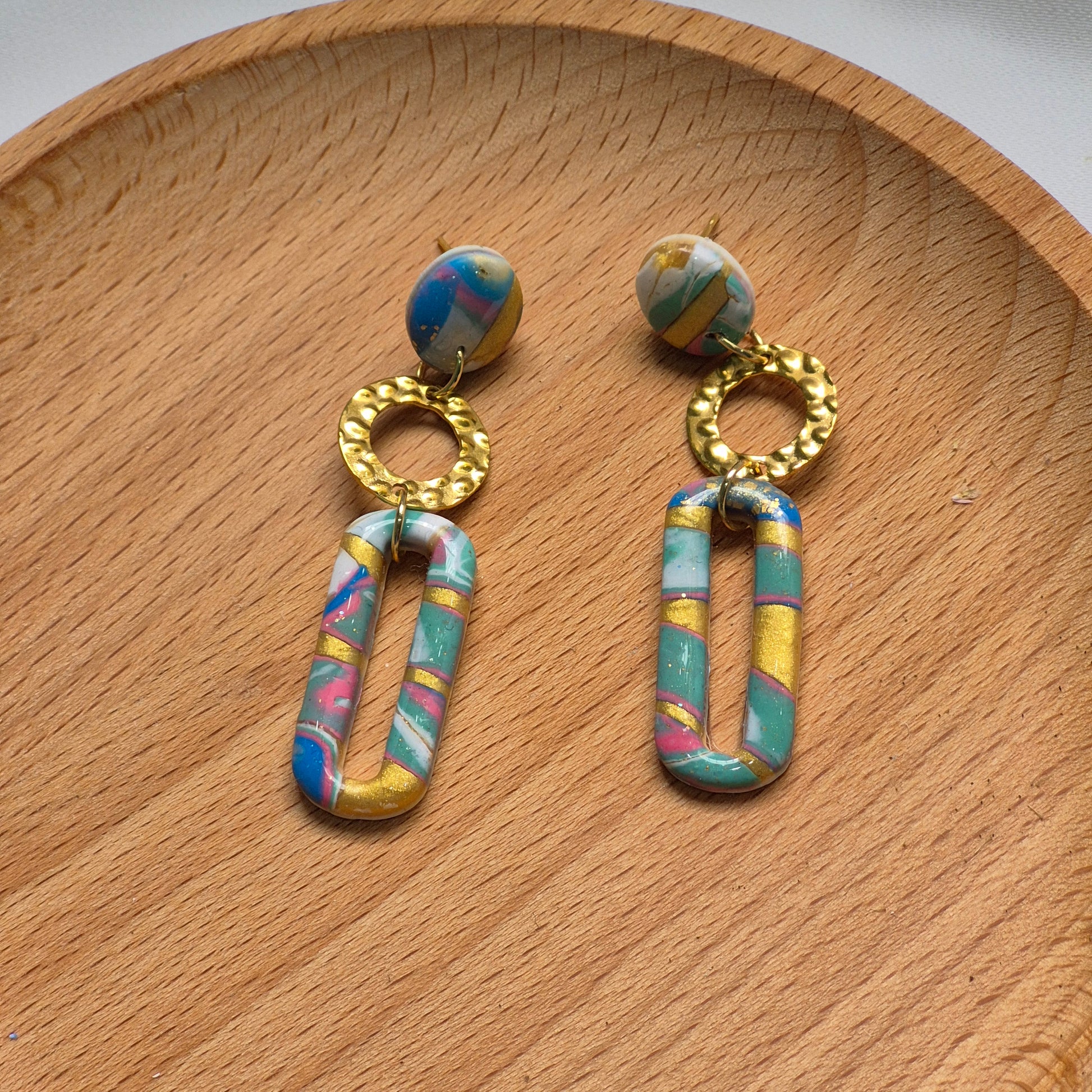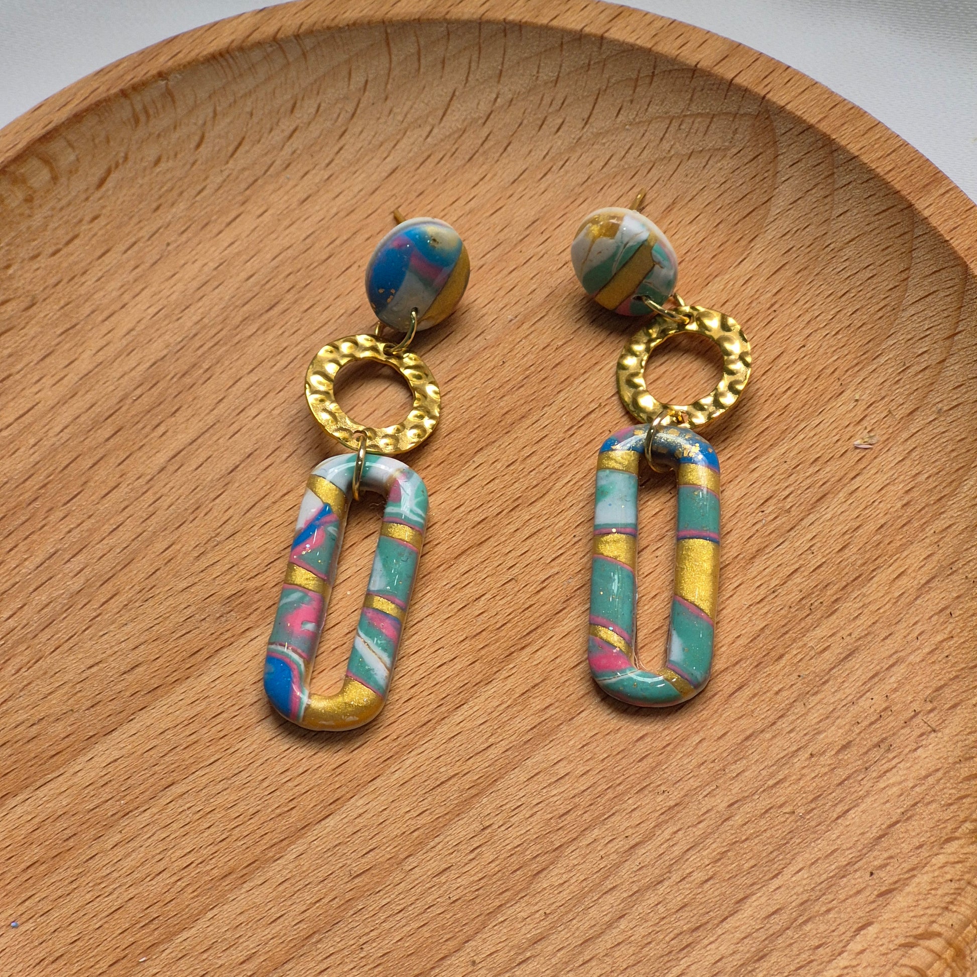 Los pendientes "Oasis Dorado" combinan la artesanía contemporánea con un aire bohemio-chic. Están hechos a mano en arcilla polimérica con formas alargadas tipo eslabón, donde se entrelazan tonos turquesa, azul, rosa y blanco, decorados con sutiles toques de dorado metálico. Cada pieza es única, con un patrón marmoleado que recuerda a paisajes exóticos y aguas cristalinas.
