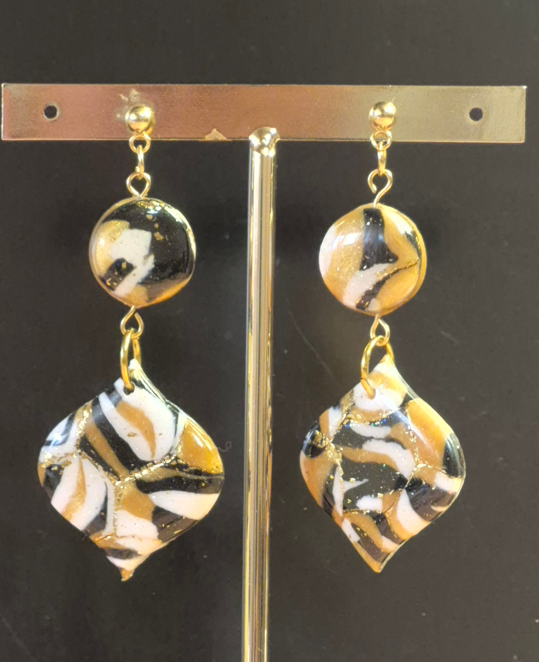 Descripción: Pendientes artesanales elaborados en arcilla polimérica con un diseño inspirado en estampados animales, combinando negro, blanco y dorado con un acabado brillante. Su forma geométrica aporta movimiento y originalidad, mientras que la base metálica en acero inoxidable dorado asegura resistencia e hipoalergenicidad.