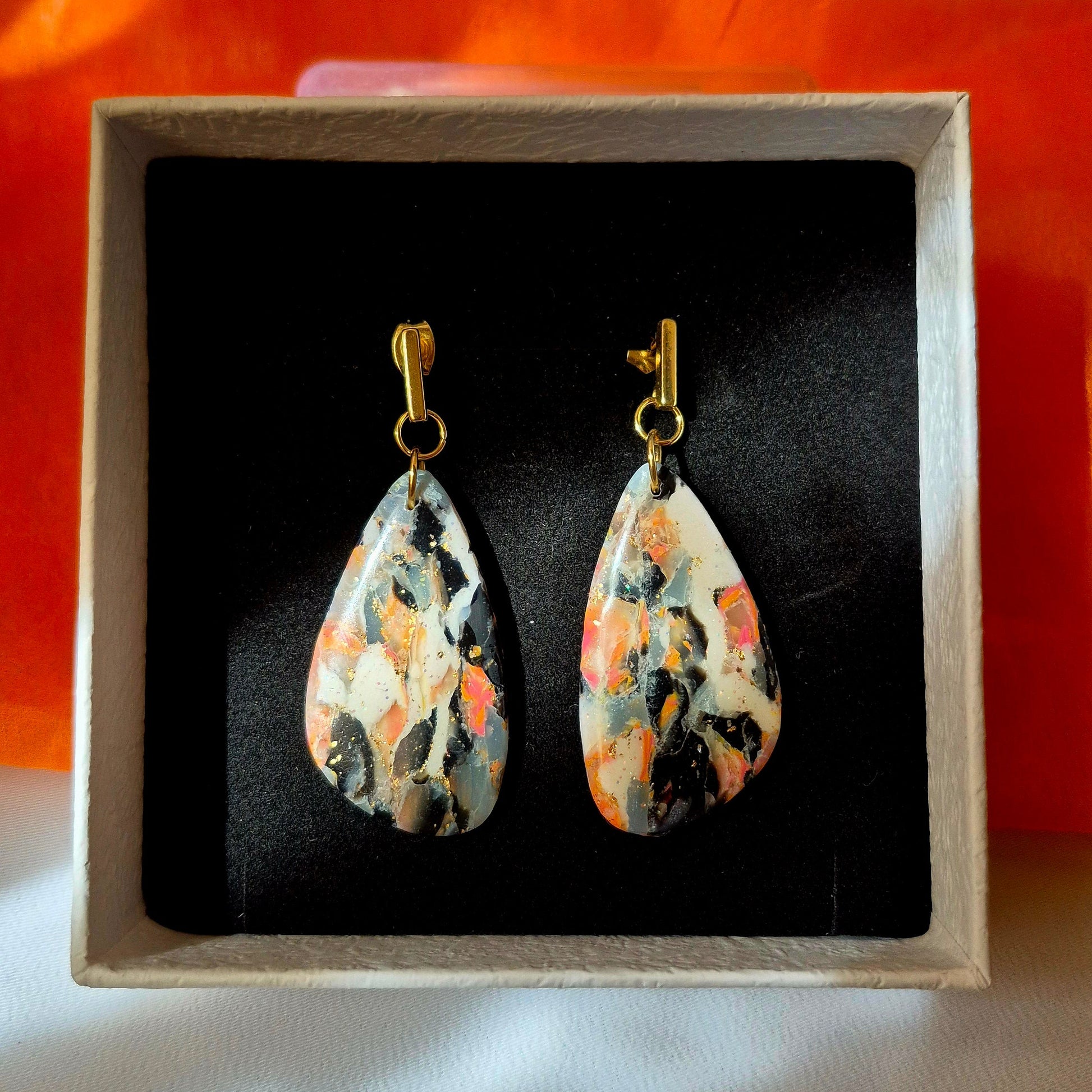 Estos pendientes hechos a mano tienen un diseño elegante y artístico. Son colgantes en forma de lágrima con un patrón de colores vibrantes, que incluyen negro, blanco, naranja y detalles dorados, lo que les da un efecto marmolado o terrazzo. Los ganchos y aros dorados añaden un toque sofisticado.