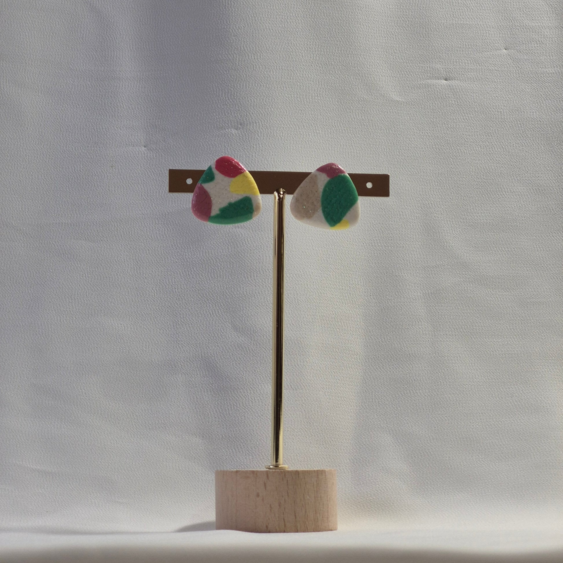 Aretes pequeños de arcilla polimérica en forma de triángulo redondeado, con un vibrante diseño multicolor que recuerda a la alegría del verano. La base blanca está decorada con manchas orgánicas en tonos verde esmeralda, rosa, amarillo, beige y burdeos. Su acabado brillante resalta los colores y aporta un toque moderno. Son ideales para quienes buscan accesorios únicos, ligeros y llenos de personalidad para complementar looks casuales o darle vida a un atuendo neutro.
