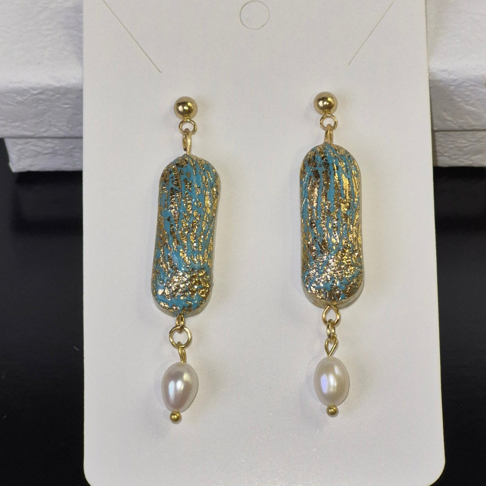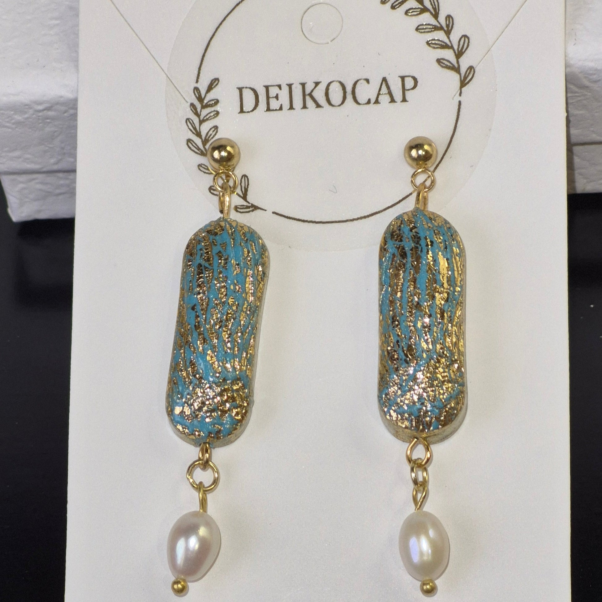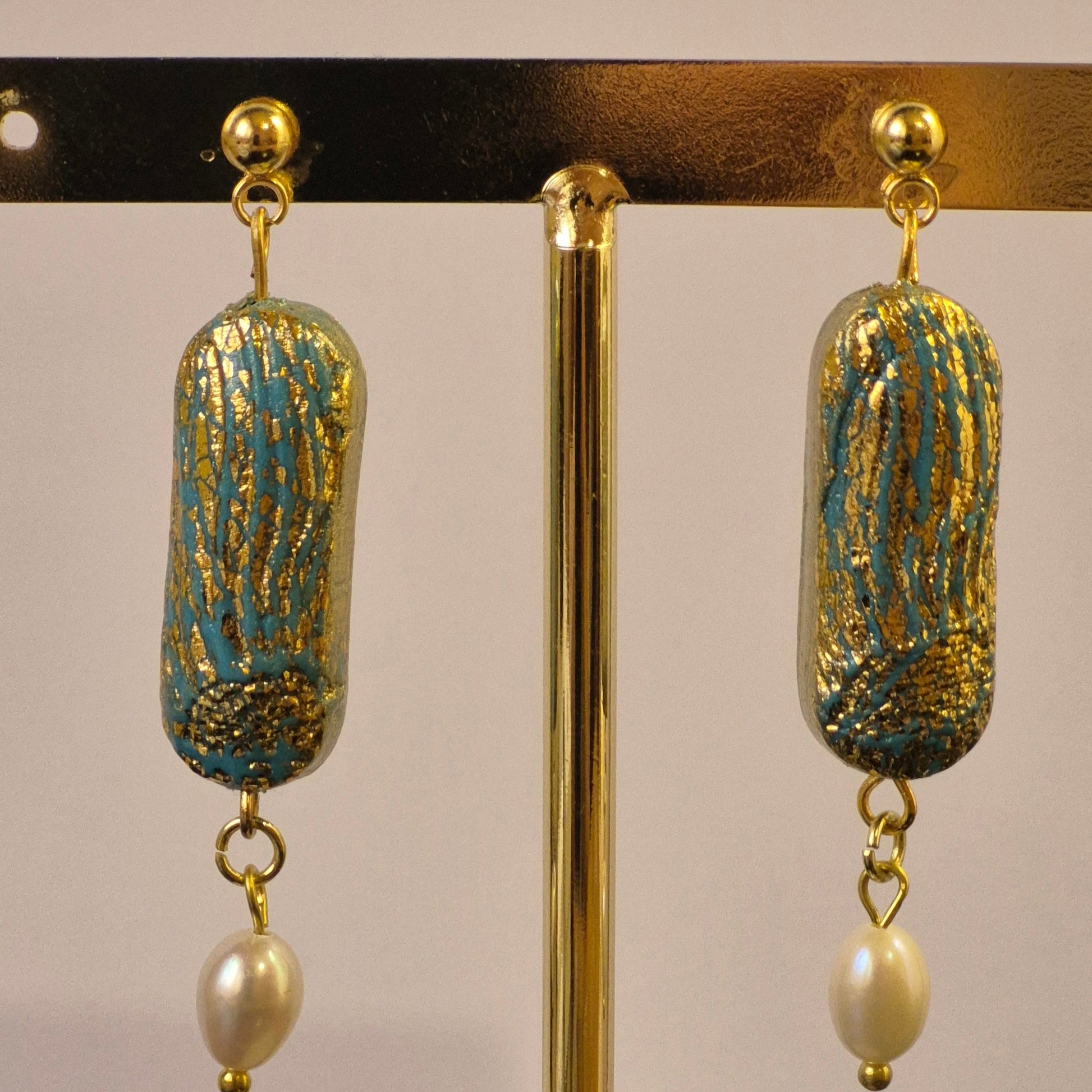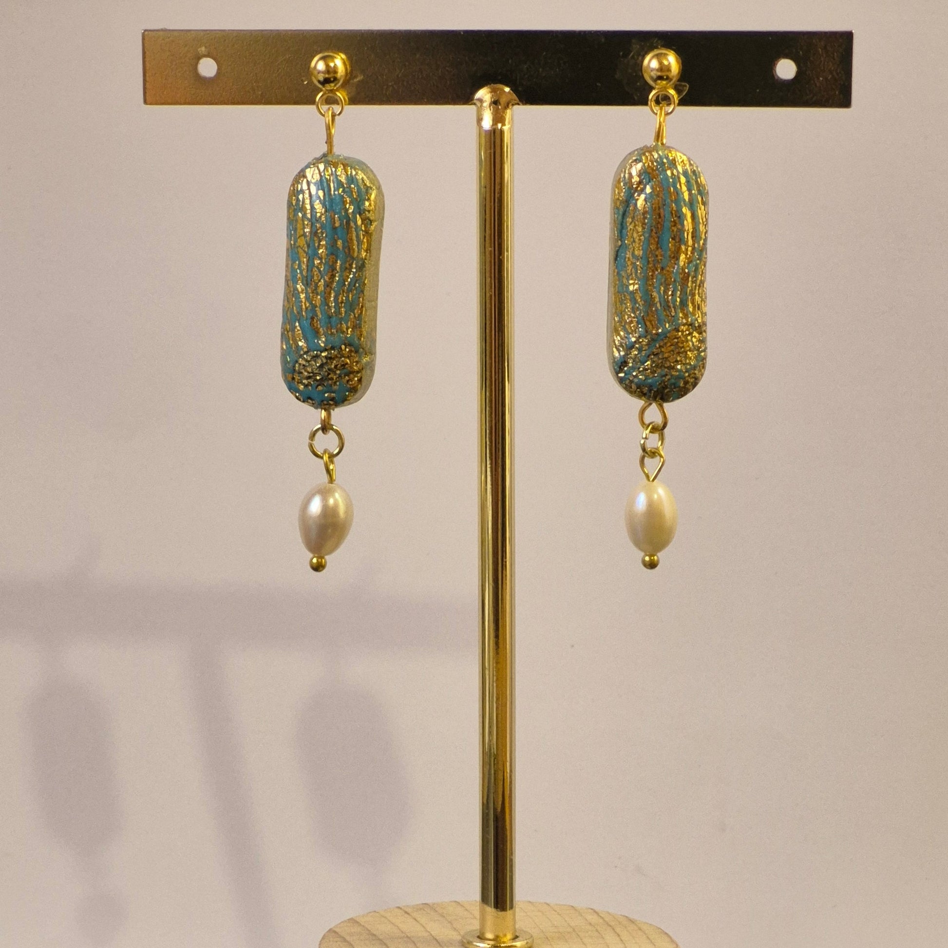 Elegancia costera en estado puro. Los pendientes Perla del Mar están elaborados a mano en arcilla polimérica azul turquesa, con un delicado grabado dorado que recuerda las texturas del coral o las olas. En la parte inferior, una gota perlada blanca nacarada cuelga suavemente, aportando un toque clásico y sofisticado.