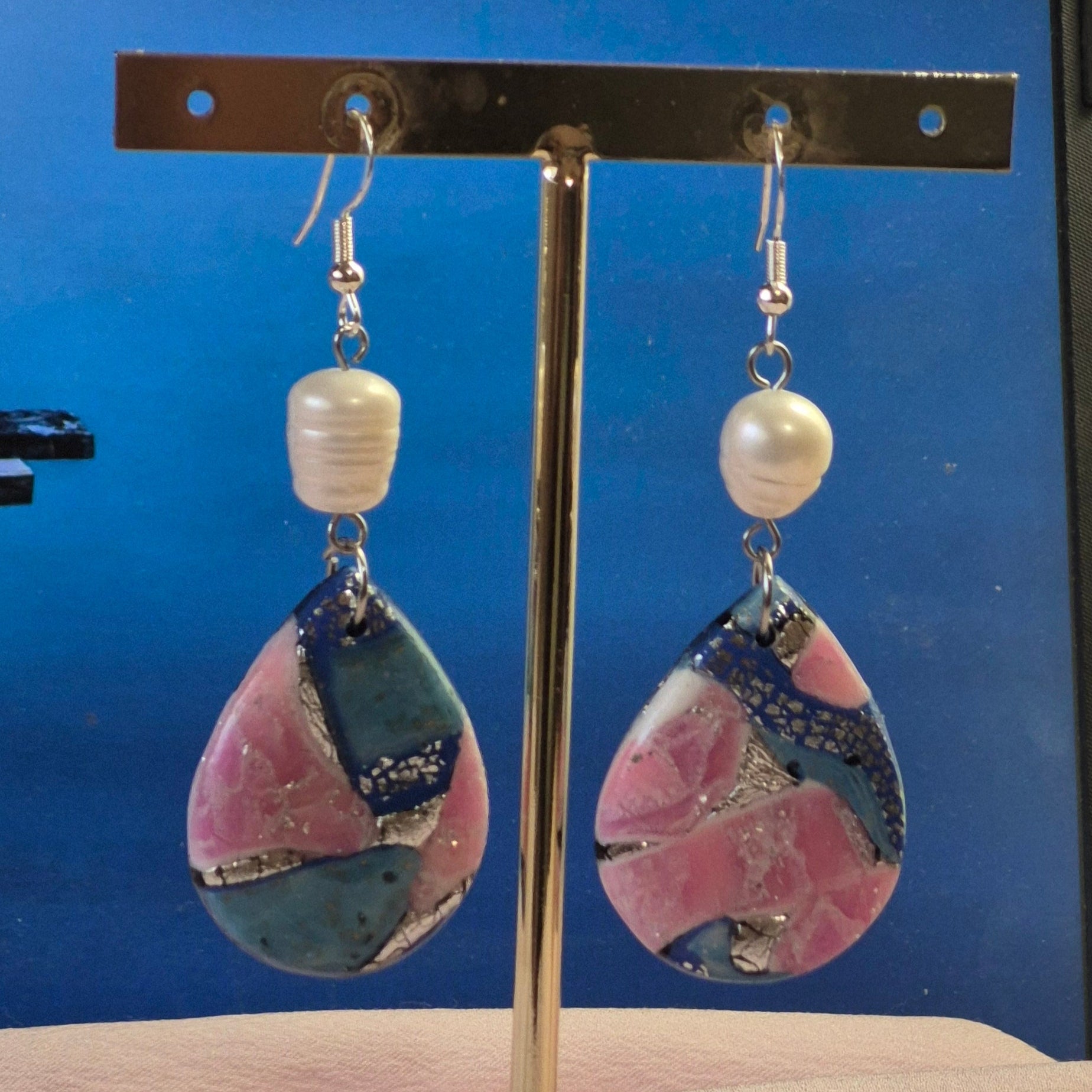 Hechos a mano en arcilla polimérica, combinan tonos rosa y turquesa con delicados destellos plateados 🌸🌊. Cada pieza está coronada con una auténtica perla de agua dulce , símbolo de elegancia natural.