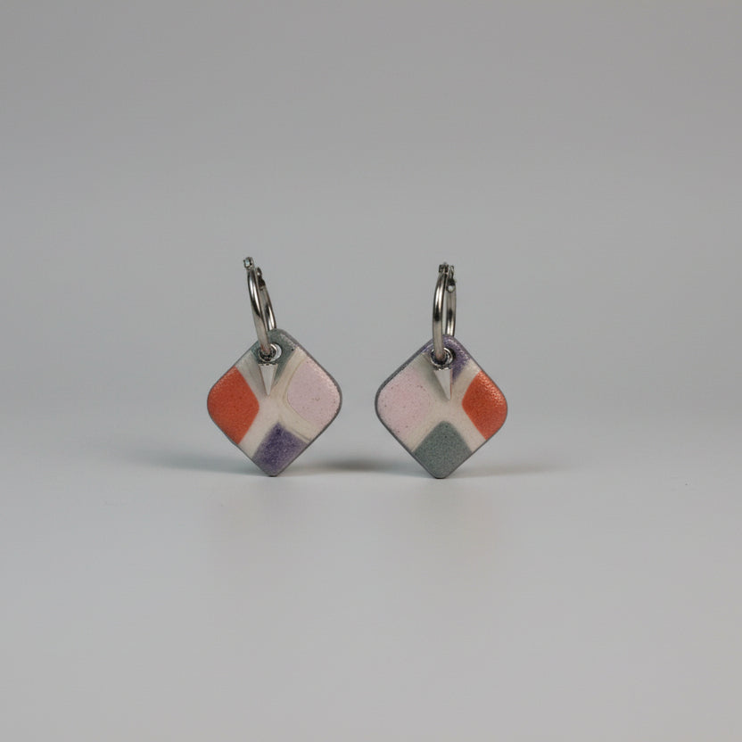 Los Pendientes Prisma Suave están elaborados a mano en arcilla polimérica , con una delicada composición geométrica en tonos pastel —coral, azul empolvado, verde agua y blanco— que aporta frescura y equilibrio visual. Su forma romboidal suavizada y el acabado satinado crean un efecto moderno y ligero, ideal para un estilo contemporáneo y refinado.
