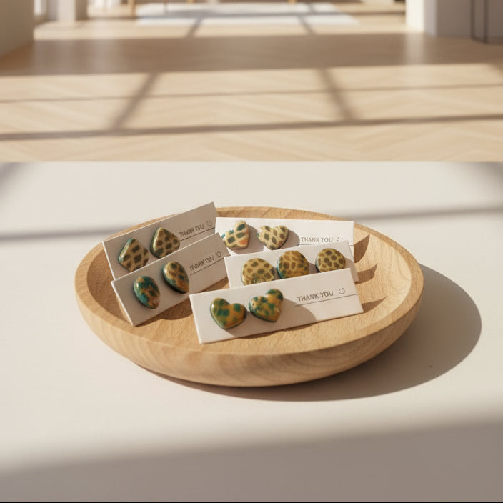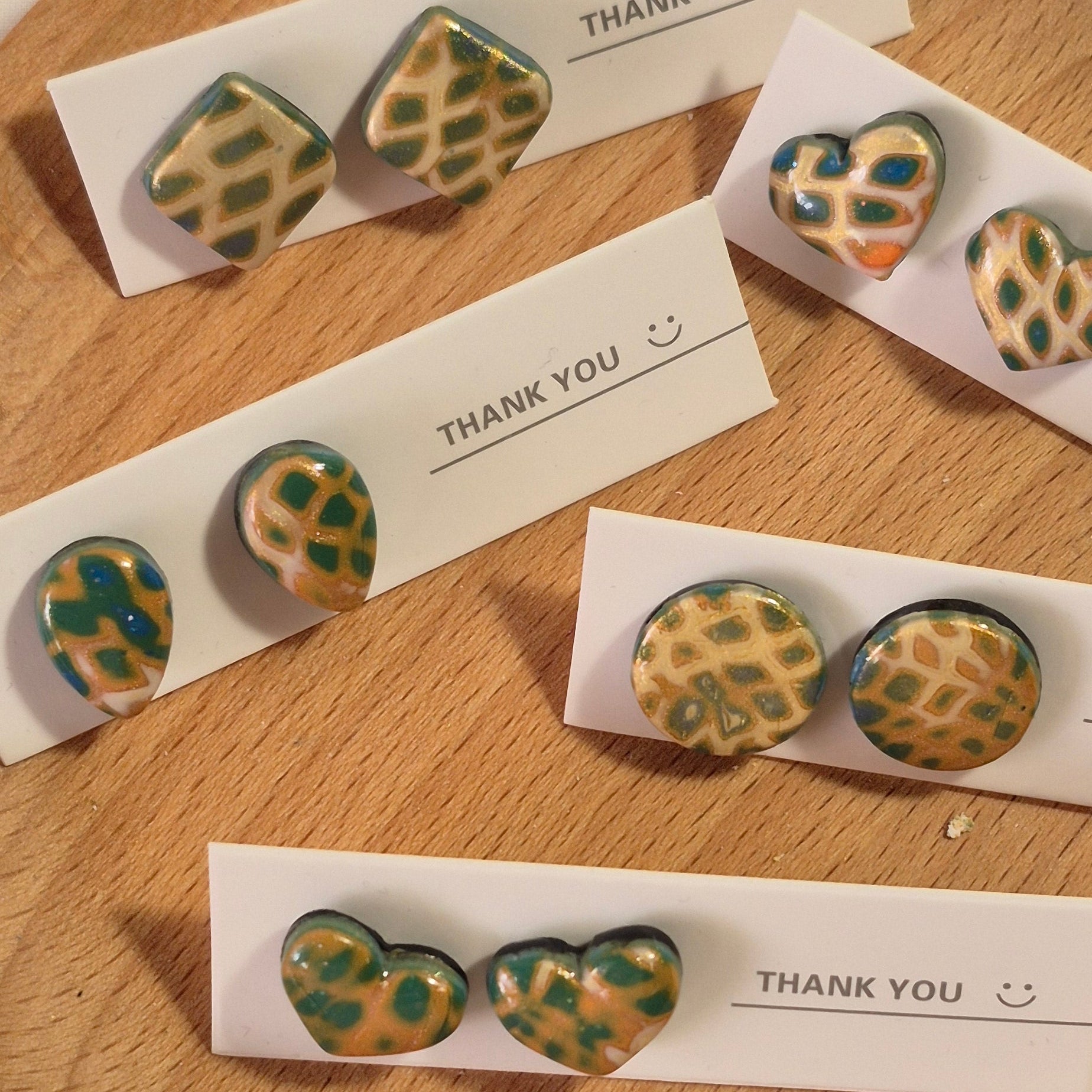 La Colección Raíces celebra la conexión entre la tierra, el color y la forma. Cada par de pendientes está hecho a mano en arcilla polimérica, con un acabado brillante y un patrón inspirado en las texturas orgánicas de la naturaleza.
