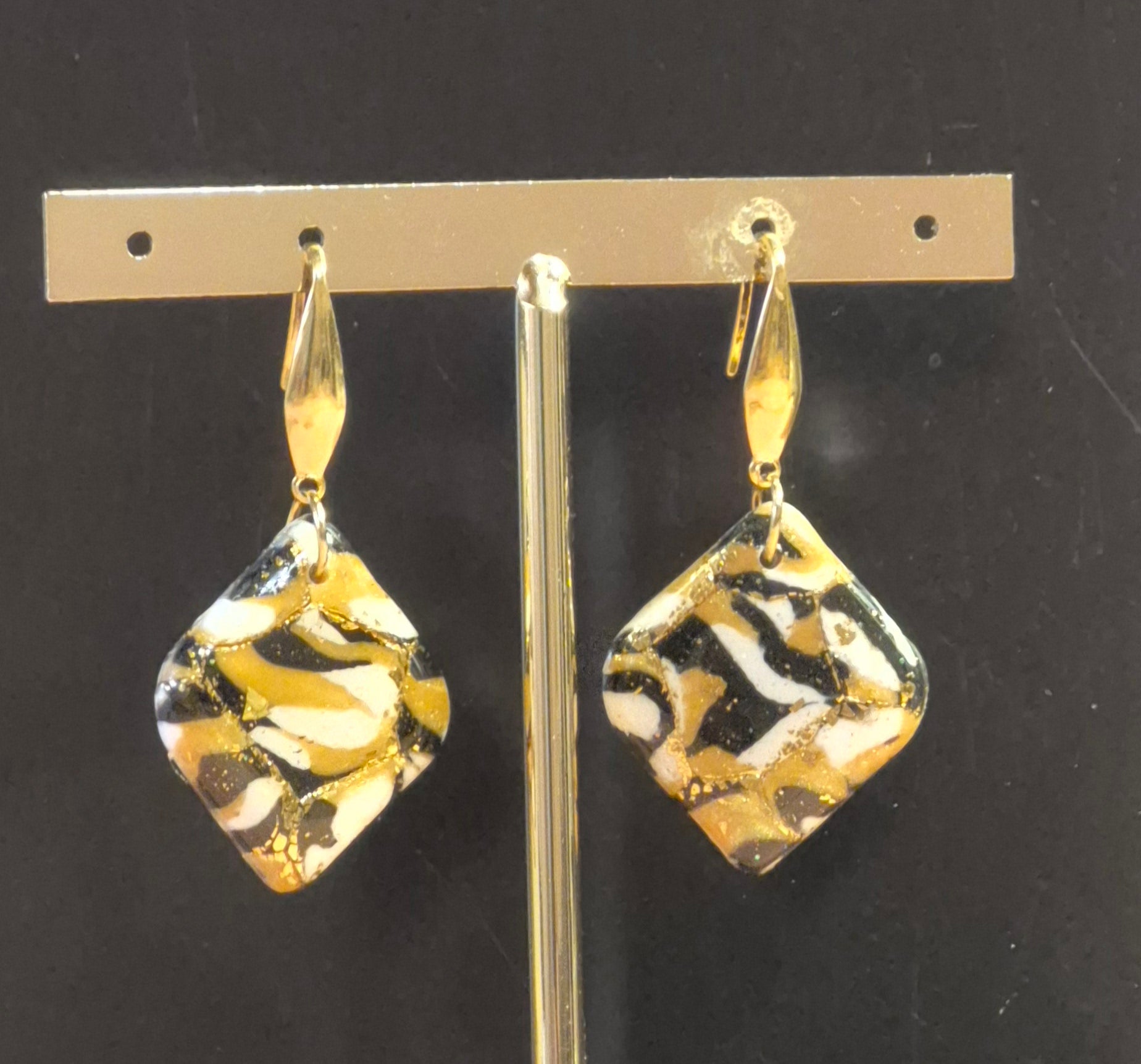 Pendientes artesanales de arcilla polimérica en forma cuadrada, con un diseño inspirado en la fuerza del safari. Los tonos negro, blanco y dorado se combinan en un estampado abstracto que recuerda al animal print, con toques brillantes que aportan luz y elegancia.