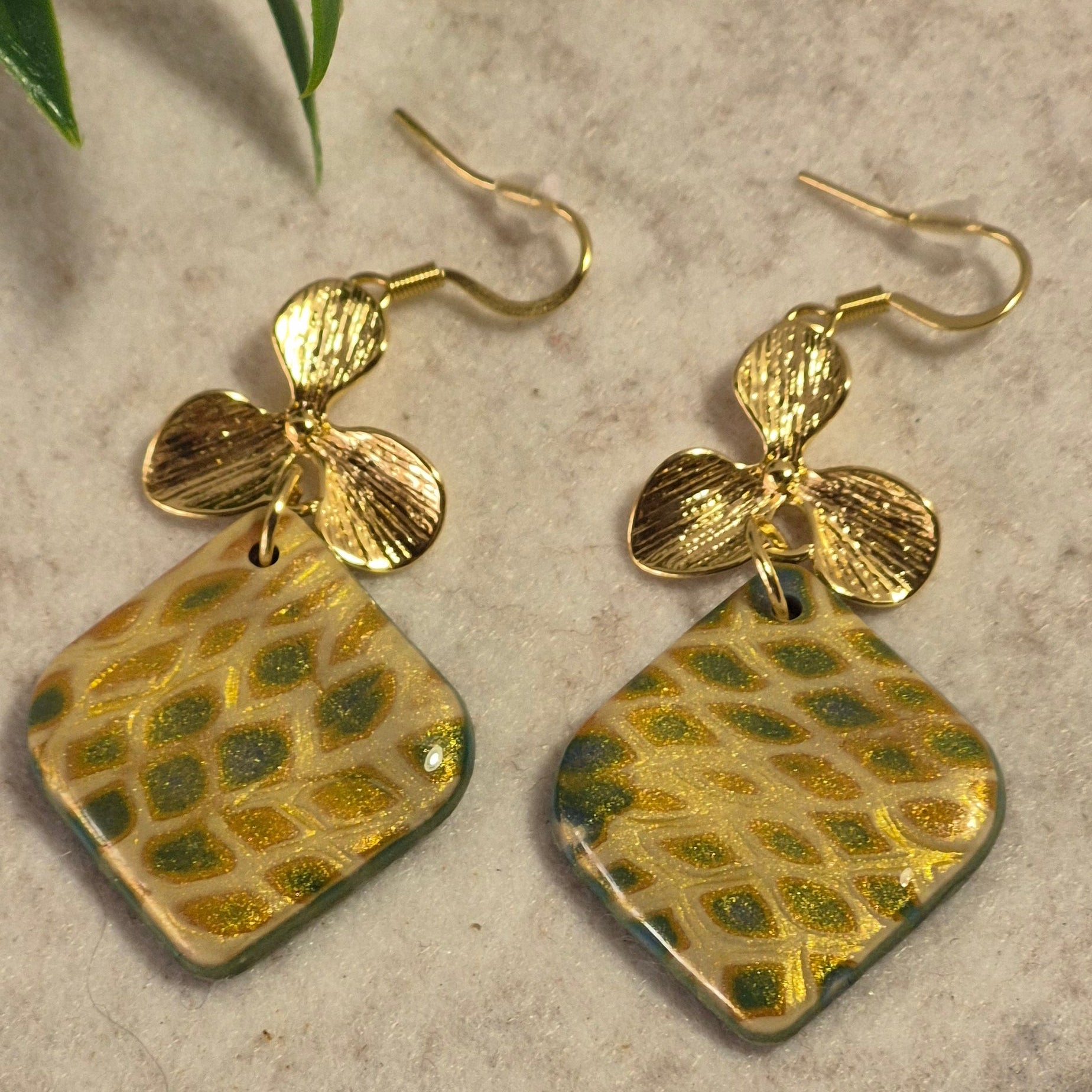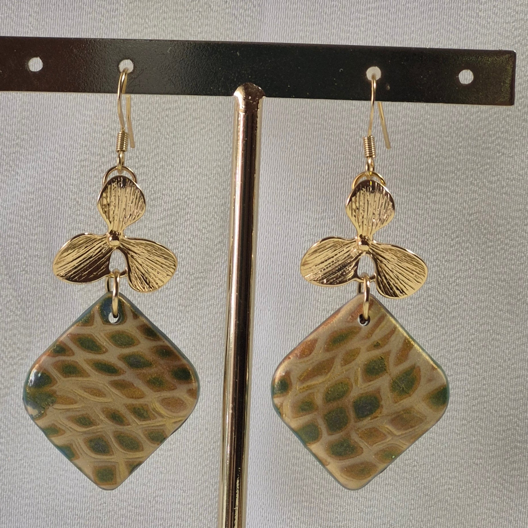 Cada pendiente está modelado y pintado a mano con sumo cuidado, creando un efecto visual único —ningún par es igual a otro—. Los colgantes de resina artesanal se combinan con un delicado detalle dorado en forma de flor, aportando movimiento, brillo y un aire sofisticado.