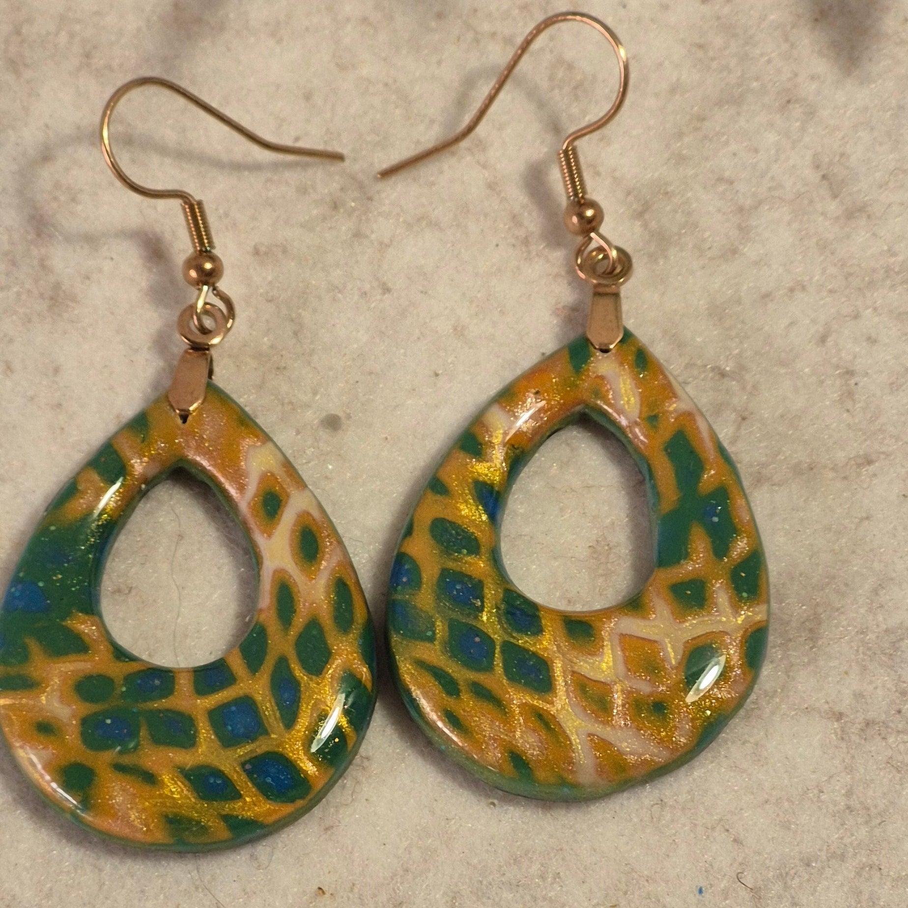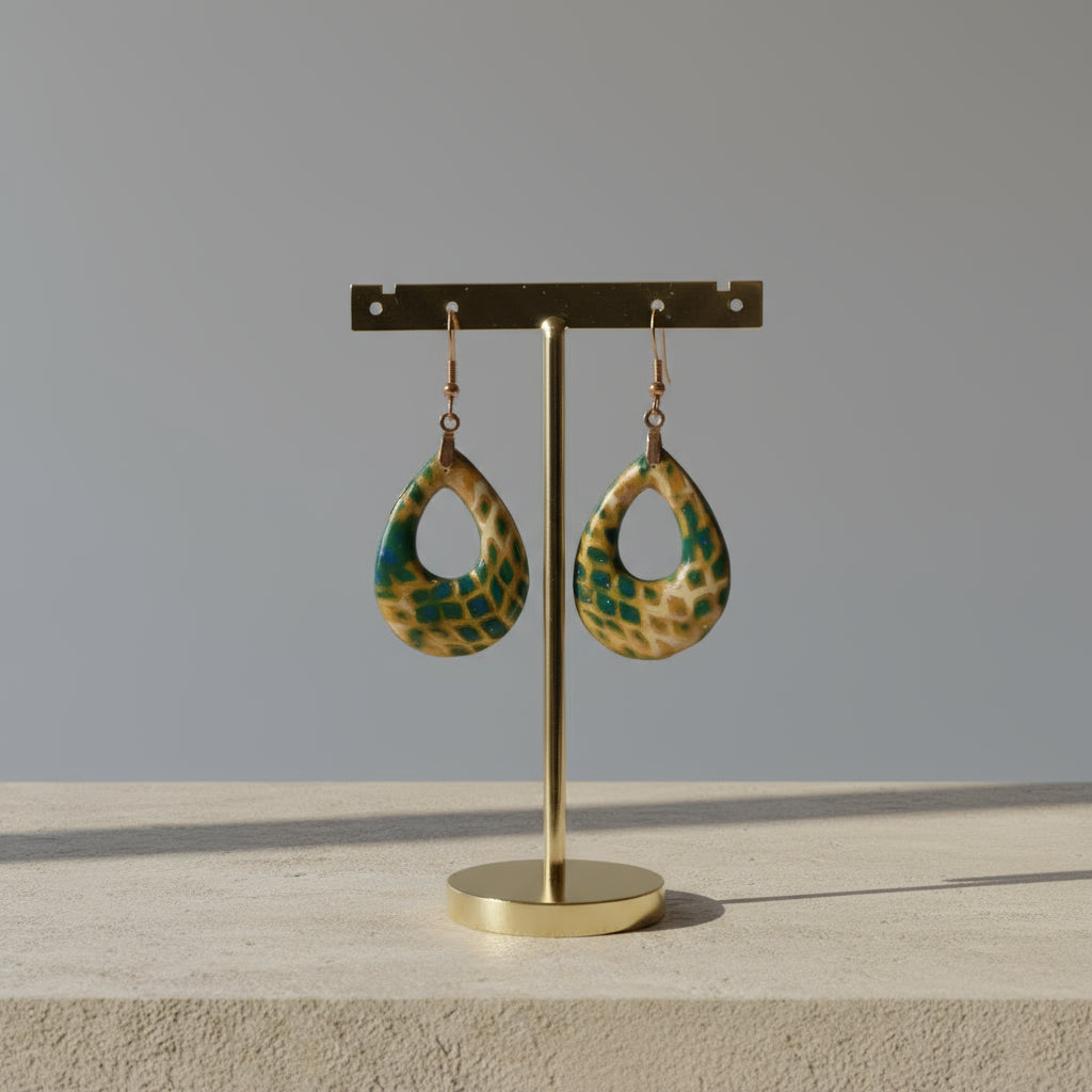 Cada pendiente presenta un patrón orgánico con tonos verde selva, dorado y azul profundo, evocando la textura de la naturaleza salvaje y la elegancia del brillo metálico.