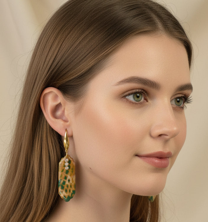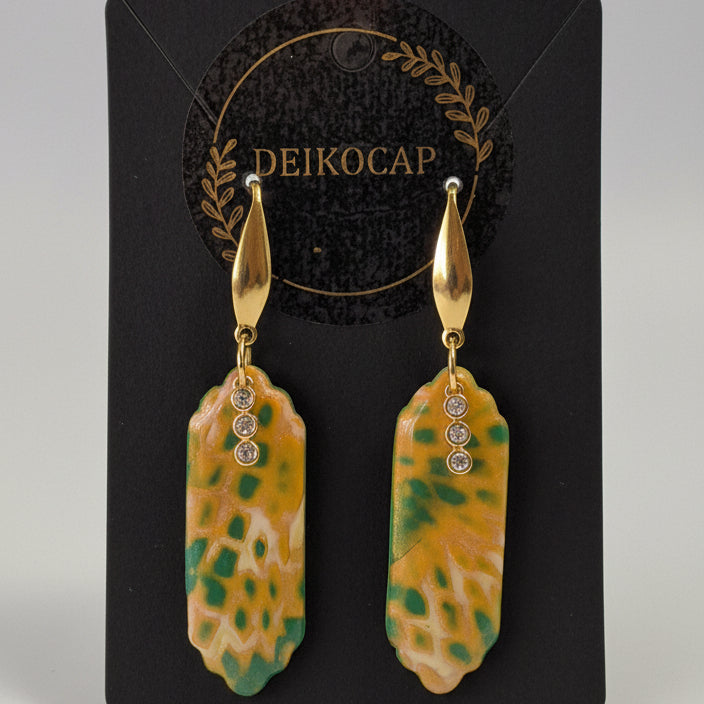 Hechos a mano en arcilla polimérica , presentan un patrón orgánico en tonos verde esmeralda y dorado , con un delicado brillo que recuerda la luz filtrándose entre hojas. 🌿