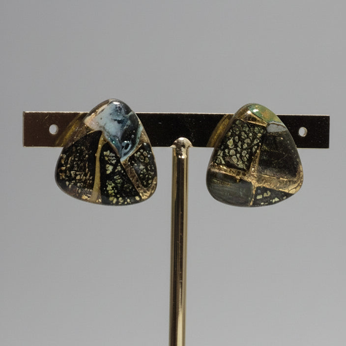 Pendientes artesanales con forma triangular, elaborados con un diseño abstracto que combina tonos negros, verdes y azulados. Incorporan vetas doradas que cruzan la pieza, creando un efecto elegante y único. Su acabado brillante y su estilo artístico los convierten en un accesorio ideal tanto para uso diario como para ocasiones especiales.