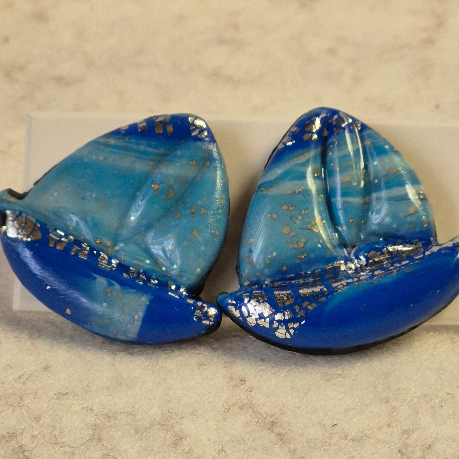 Pendientes artesanales en forma de velero, elaborados en arcilla polimérica con tonos azules que van del turquesa al índigo, decorados con finos detalles en dorado que evocan el reflejo del sol en el mar. Su forma delicada y diseño náutico los convierte en el accesorio ideal para espíritus libres y amantes del océano.