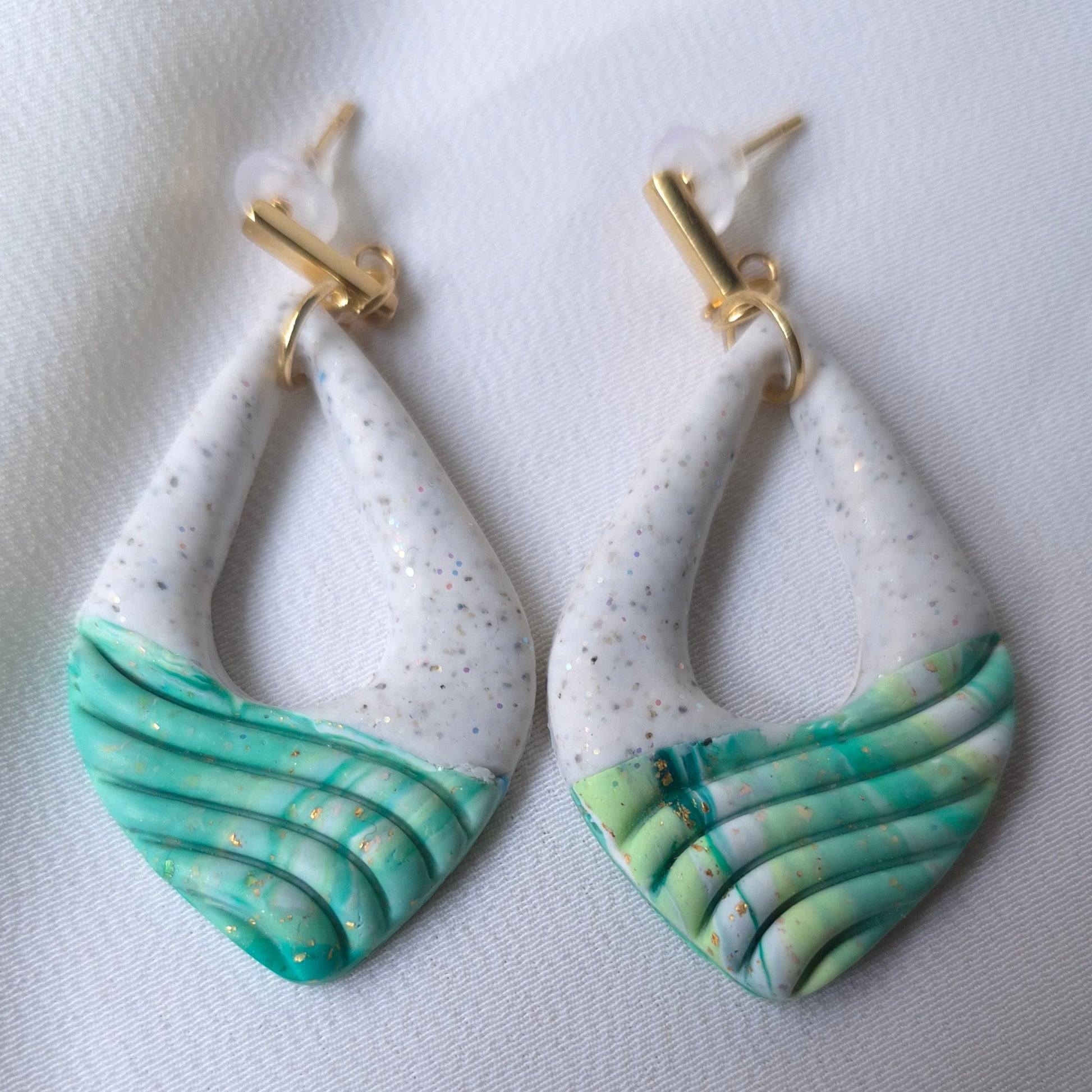 Inspirados en la tranquilidad del mar y la pureza de la arena, estos pendientes combinan tonos blancos con detalles verdes y turquesa, evocando las suaves olas que acarician la costa. Con un diseño elegante y una textura ondulada, cada pieza captura la esencia de la naturaleza con un toque de sutil brillo. Perfectos para un estilo fresco y sofisticado.